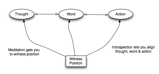 I think there is a reason for that. I think the reason meditation gets me into witness position is to let me align things. What things? My thoughts, my speech and my action. The triumvirate of my daily life. It lets me subtly adjust these things so that they align. In India there is a word for that – ‘Trikaranasuddi‘ – the matching of thought, word and deed. By noticing myself during the day I become observant of what I am thinking, speaking and doing. Any mis-match produces stress and thereby gets me to correct it.